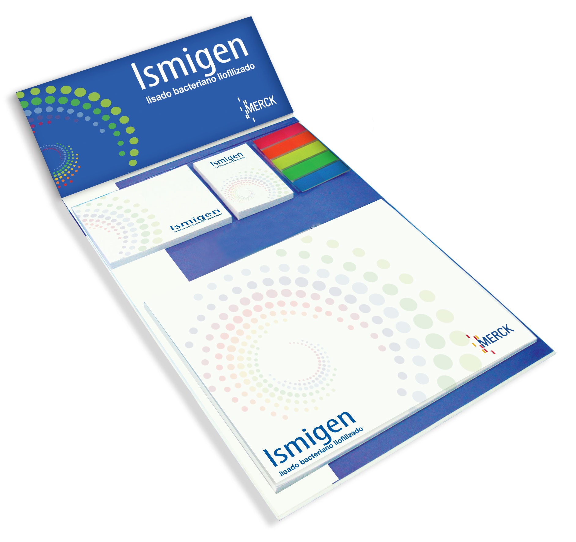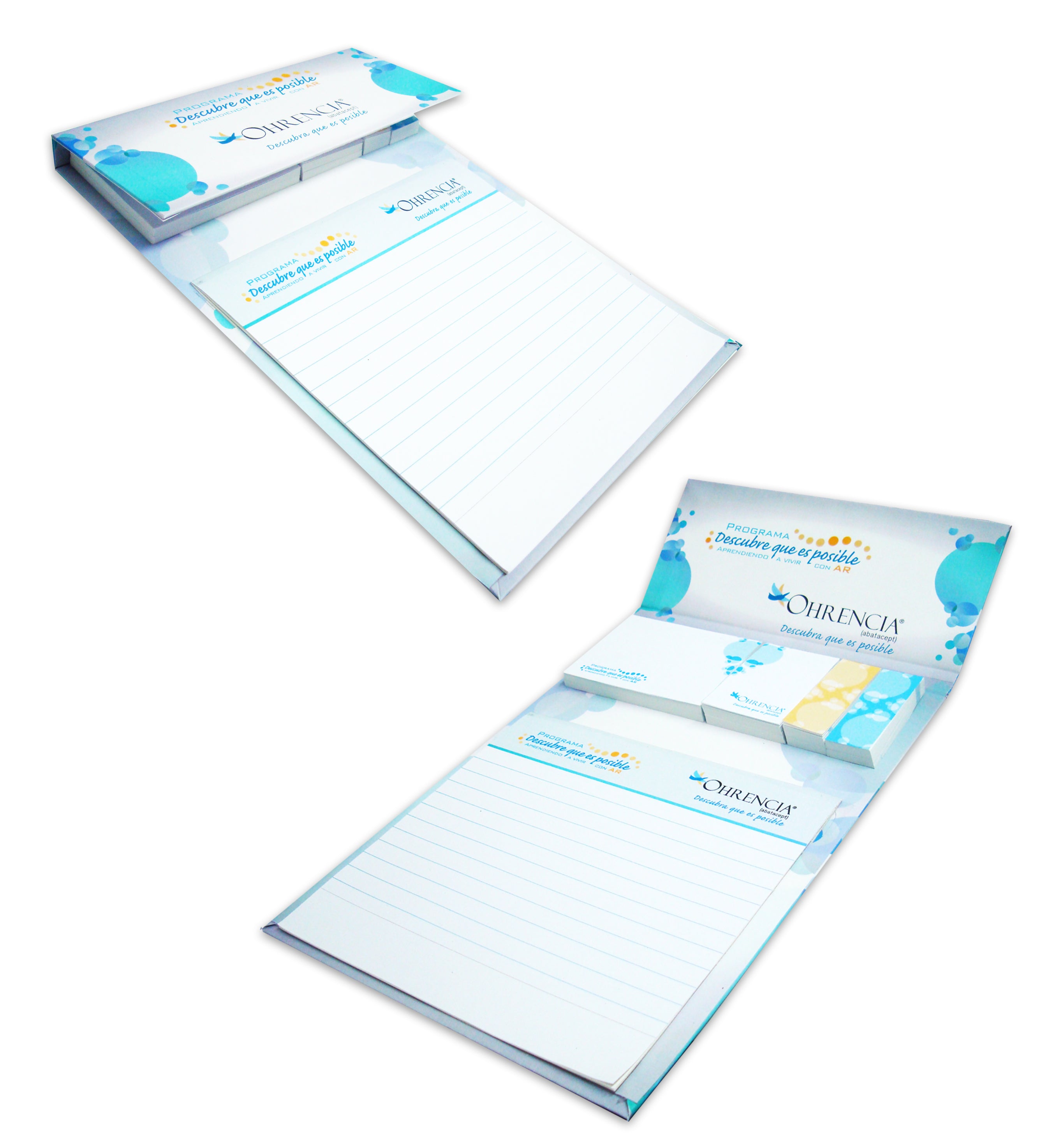 Tabla rígida con solapa, de diseño especial, conteniendo 2 blocks de notas adhesivas Post-it 2" x 3" y 3" x 4", 100 banderas de acetato mini de 5 colores, o banderitas señaladoras de papel adhesivas, block media carta.