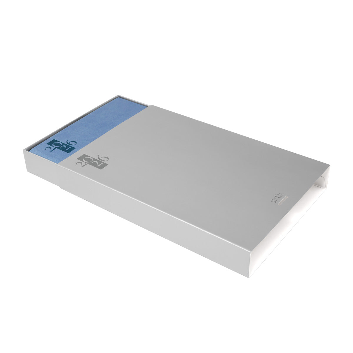 Agenda diaria con 186 hojas. Contiene datos personales, calendarios 2025-2026-2027, planeador 2026, presupuesto de gastos, seguimiento de nuevos hábitos, organizador de tareas, planeador de proyectos y días festivos. Incluye caja individual.