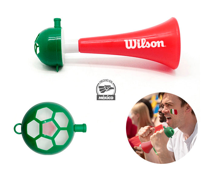 Corneta tricolor con boquilla y arillo para colgar. Con diseño de balón de fútbol.