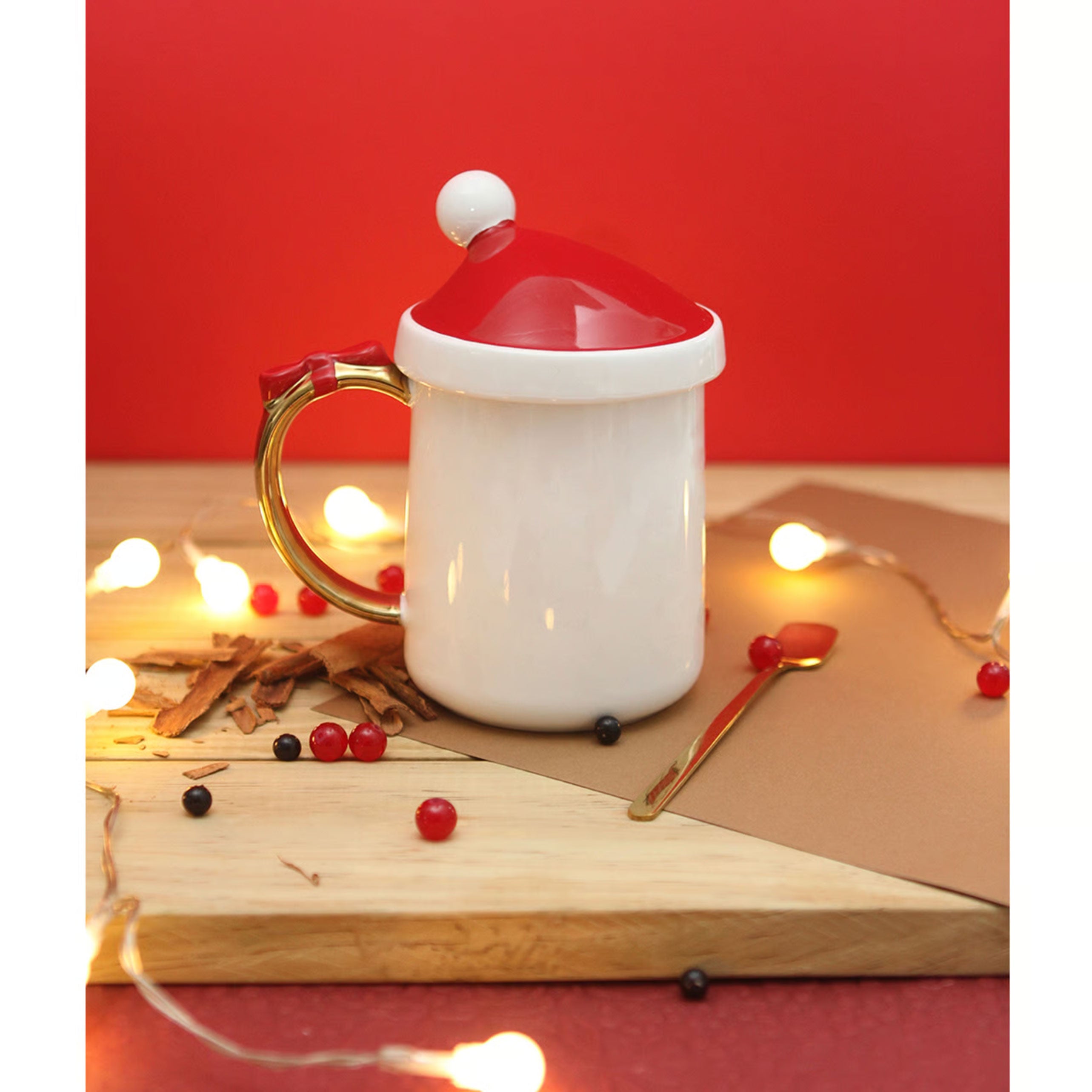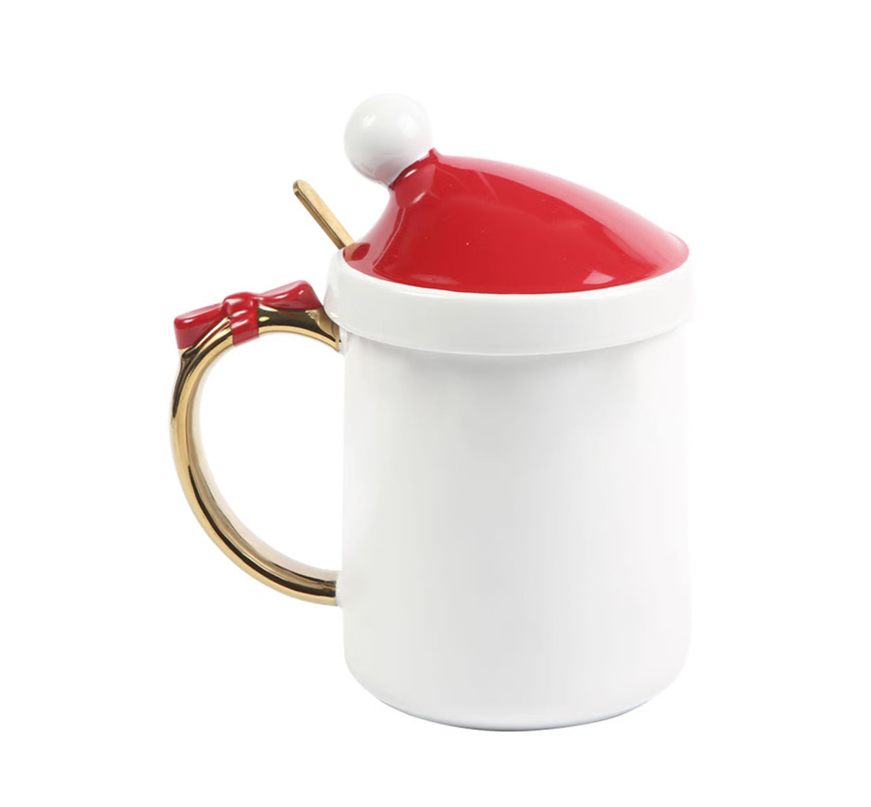 Taza de cerámica con detalles de navidad dorados en asa, incluye cuchara metálica, fabricados en materiales de grado alimenticio, no aptos para microondas. Capacidad de 400 ml. Incluye caja de cartón individual.